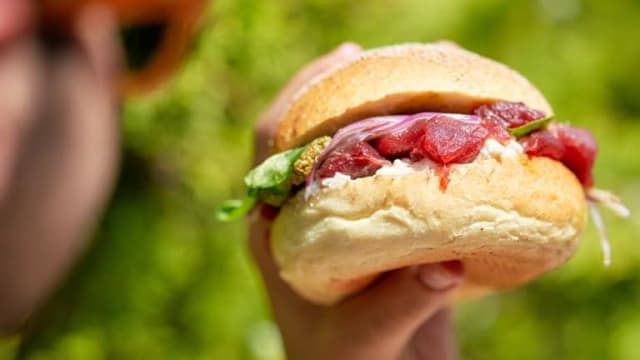 Pan brioches Giapponese di nostra produzione, pesce spada croccante, cavolo cappuccio e maionese alla senape