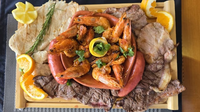 - Carne de vaca, frango,porco e salsicha grelhados - uma combinação saborosa de cubos de carne bovina suculenta, frango bem temperado e salsicha levemente tostadinha. Uma tábua completa e cheia de sabor, ideal para quem gosta de variedade na grelha.