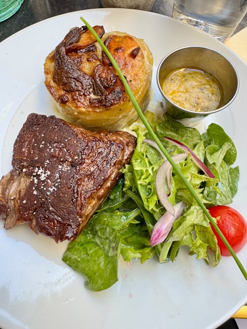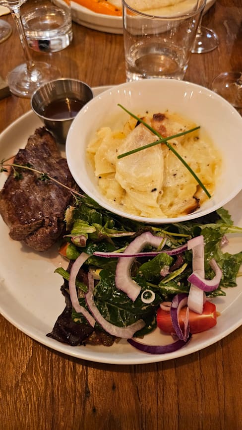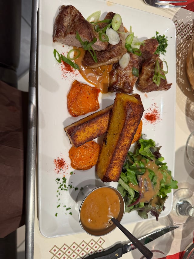 7/10Beef and pork were very tough. Side dishes (eg.potatoes and veggies) were very good as were the first courses (octopus, escargot).