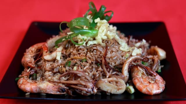 Mariscos de temporada salteados al wok, mezclados con arroz, huevo, cebolla china y salsa de soja.