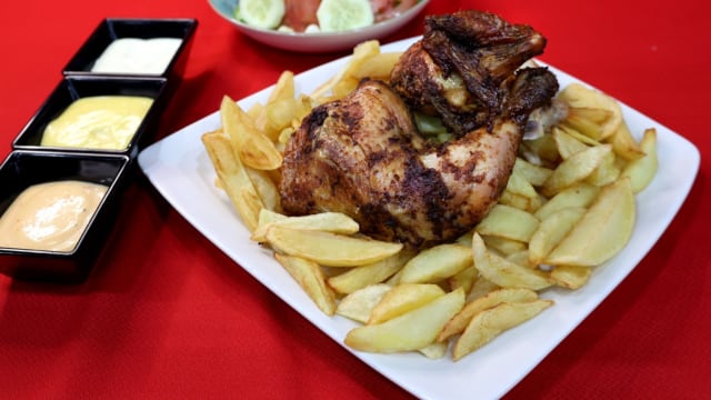 1/2 pollo a la brasa hecho al carbón acompañado de crujientes patatas fritas, ensalada y nuestras salsas.
