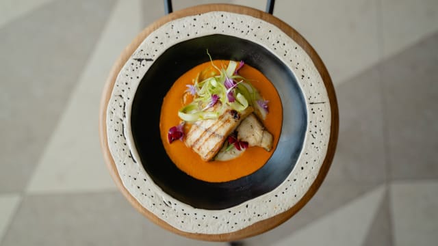 Pulpo al grill con puré de calabaza asada, crema de guanciale y pimentón de la Vera.