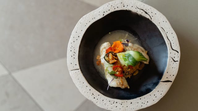 Bocadito mantou con crema agria de lima, maruca en salazón y caviar de salmón (2 unidades)