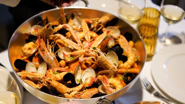 Paccheri alla Pescatora con sette varietà di frutti di mare serviti con pagnotta calda insieme, invitando a fare la scarpetta finale.
