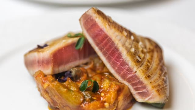 Tonno scottato marinato alla soia e zenzero con caponata siciliana