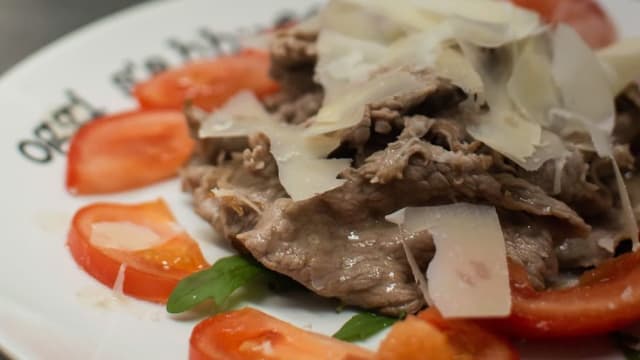 Carpaccio di manzo stufato con rucola parmigiano e arancia