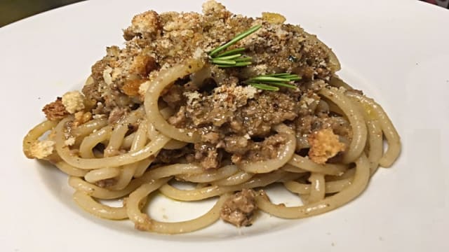 Pici alla carbonara con pancetta di cinta senese D.O.P.