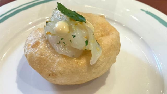 Tartara di pesce bianco, chips di riso, quinoa, verdure croccanti, avocado marmellata di cipolle/ tartara di tonno rosso, salicornia, limone, pinoli, zenzero, mostarda di pomodoro, tacos lime e pepe rosa/ cannolo di gamberi, burrata, salsa alla pizzaiola, crumble alle erbe