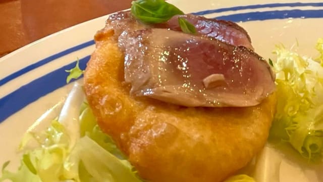 Fritto di baccalà in tempura, trucioli di pancetta, marmellata di datterino, olio al basilico