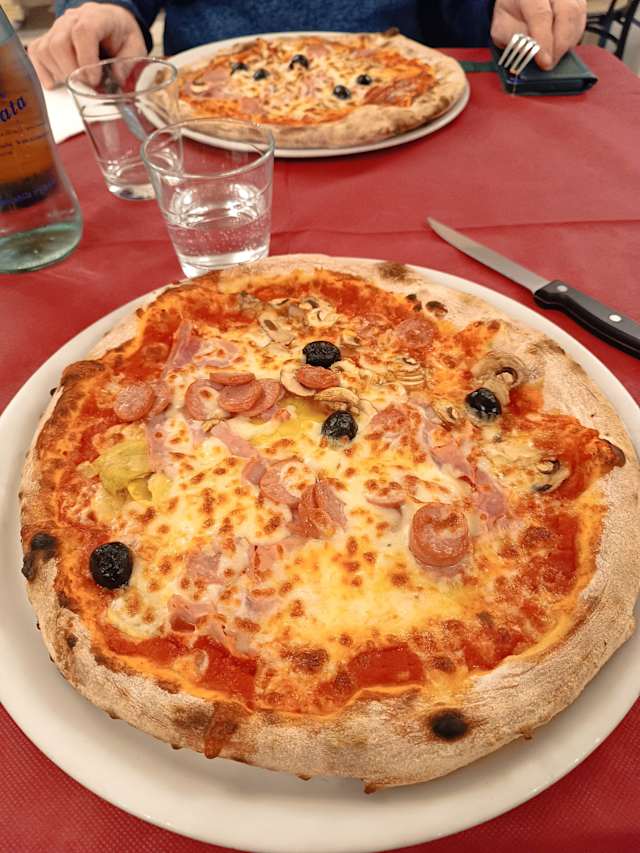 - Pomodoro, mozzarella, olive, wurstel, carciofi cotto e funghi