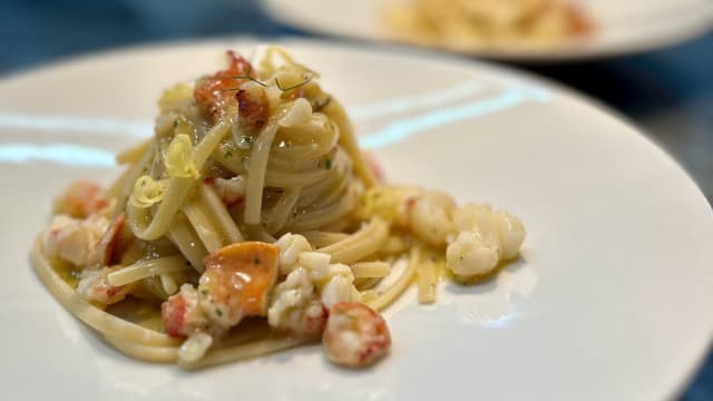 Taglierino fresco con burro nocciola, polvere di tartufo bianco pregiato e crudo di gamberi rossi del Mediterraneo
