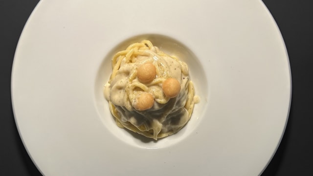 Tonnarello fresco con crema di pecorino Romano buccia nera, tre peperoncini ( Timut, Sichuan e Tallicherry ) con sfere di pecorino fritte e polvere di bergamotto