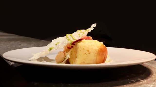 Polpo verace cotto a vapore, laccatto alla nduja di Spilinga e miele di acacia servito su crema di melanzana e la sua chips