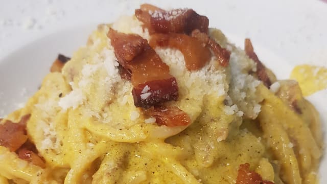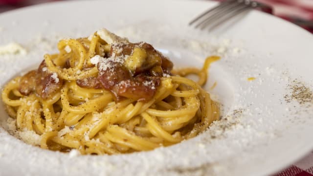 Spaghetti with egg, pork cheek, black pepper and cheeses