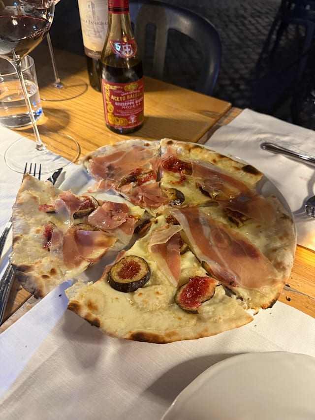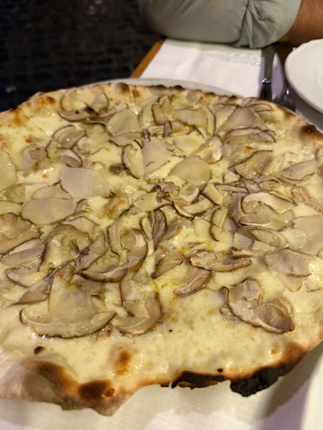 9/10The restaurant was very close to our Airbnb and always seemed crowded so we tried it our last night in Rome. They only had a 7.30pm and sat us outside very close to two other couples near the end with bright lights. Luckily both couples were nice so it worked out. We got a house Chianti bottle for $35, husband got bacala cod and really liked it (not salted) with potatoes. I got my first mushroom pizza in Italy which was wood fired and thin and really good. It was our best dinner in 4 days. Would recommend.