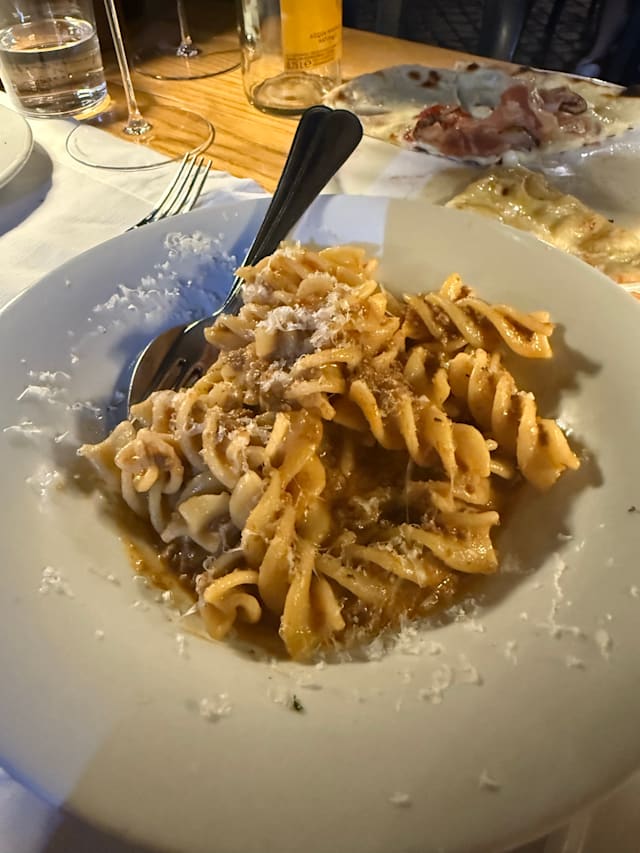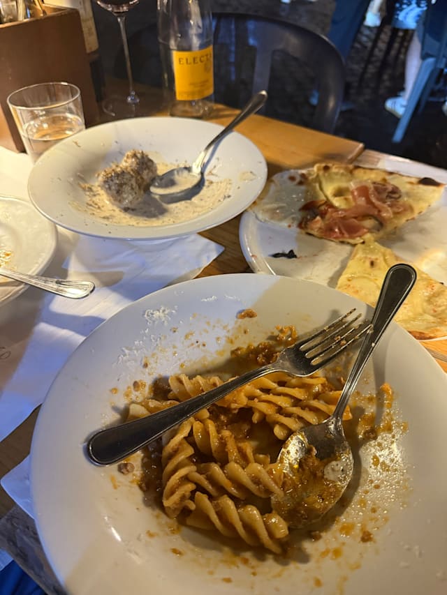 5/10Restaurant was recommended. We asked to sit outside. We were seated at the very end on the street, well away from the restaurant. Cars were passing directly behind us, very close. Seemed a bit strange. The lasagne we ordered was burnt (appeared to be reheated and they over did it) and the Carbonara was not very good (beyond al dente). The wine and beer were good. We were disappointed.