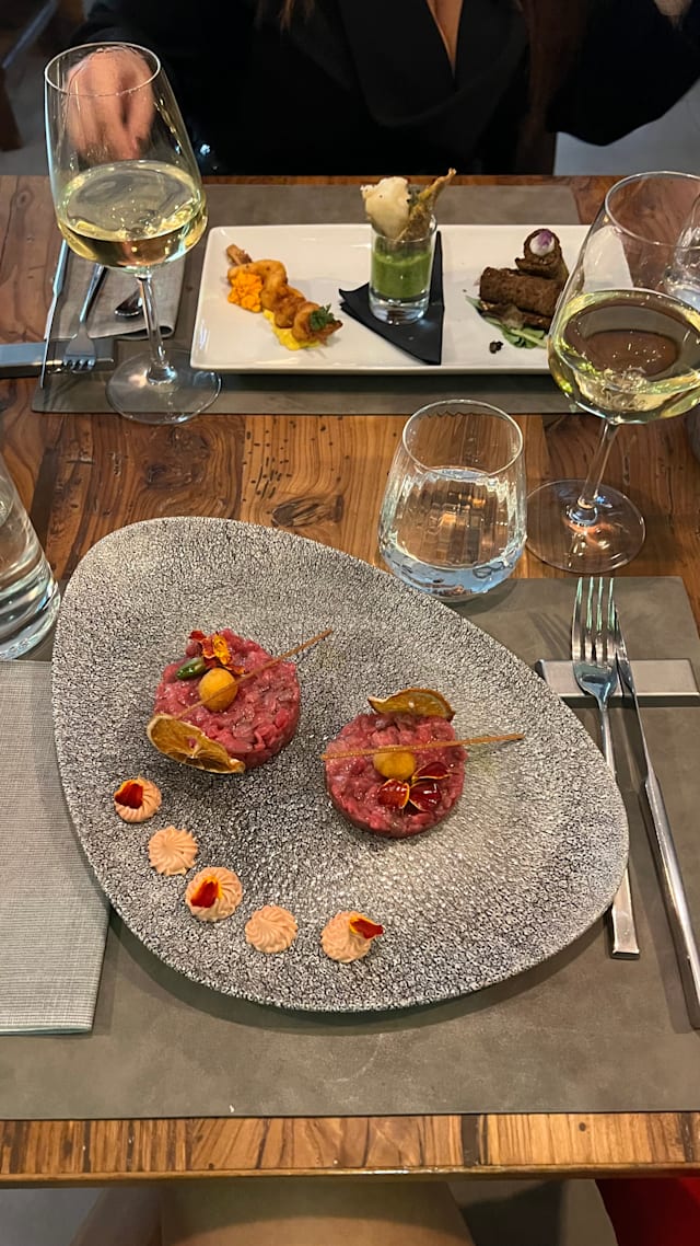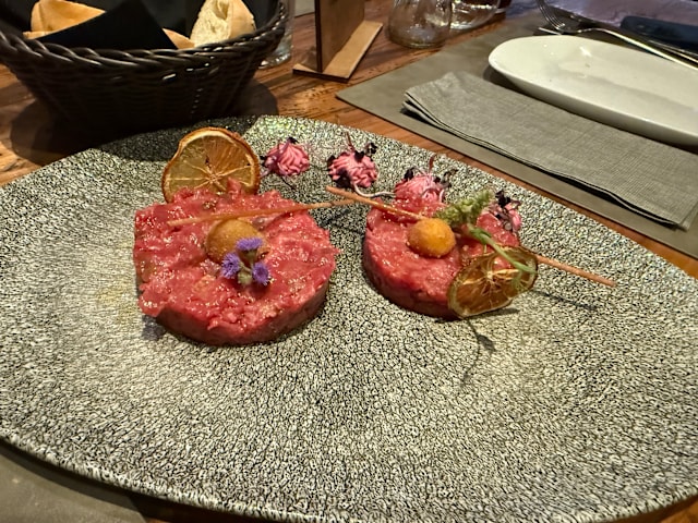 Battuto di scottona con tuorlo di quaglia croccante e maionese alla barbabietola