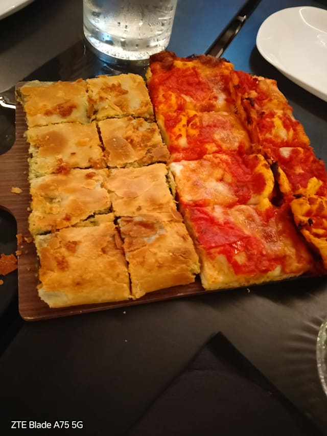 La classica / stracciatella, pesto di basilico e pomodorini confit / cipolla e salsiccia brasati con glassa al balsamico / hummus di ceci con battuto di gambero argentino marinato agli agrumi