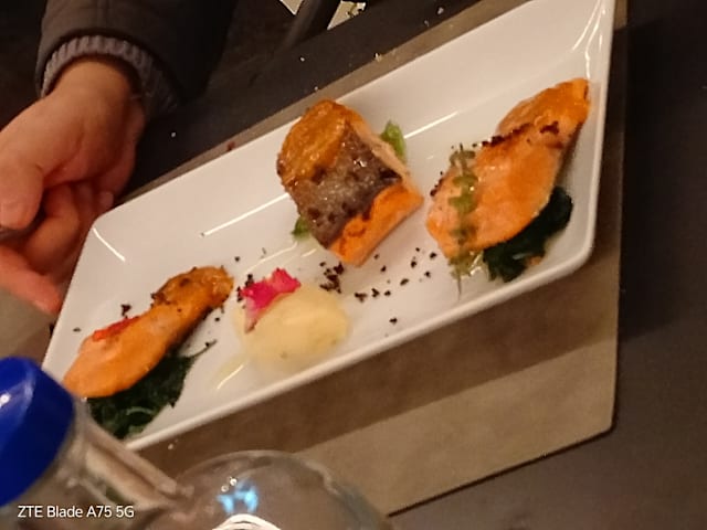 Trancetti di trota salmonata dorati, purea di sedano rapa, spinaci saltati all’aglio e terra d’olive taggiasche