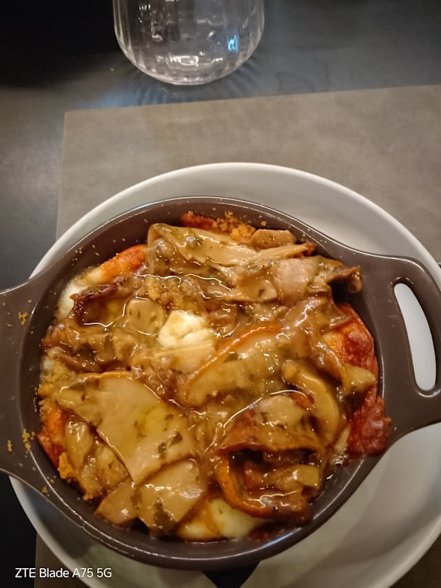 Tegamino di scamorza affumicata con funghi porcini trifolati su crostone di pane