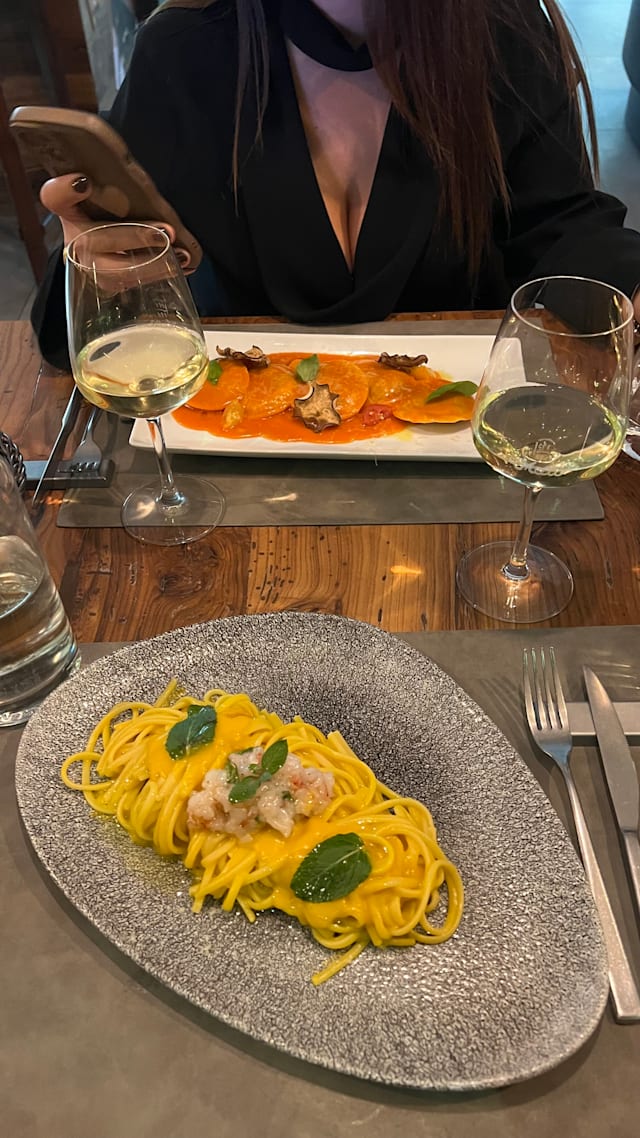 Linguine con velluatata di zucca e gambero argentino marinato alla mentuccia