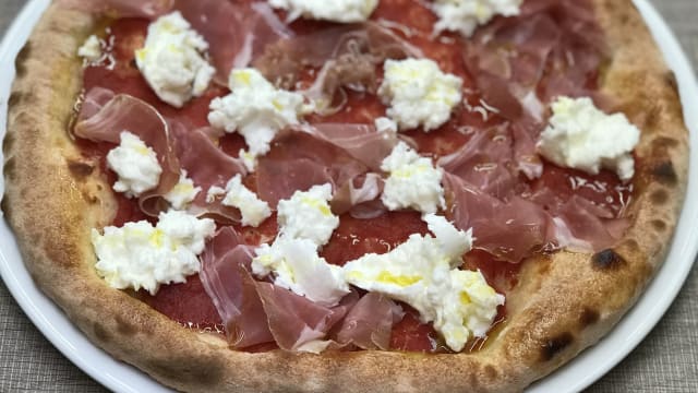 Base tomate, en sortie de four de la mozzarella di bufala dop, jambon cuit italien, champignons de paris cru, basilic, ciboulette, filet d’huile d’olive