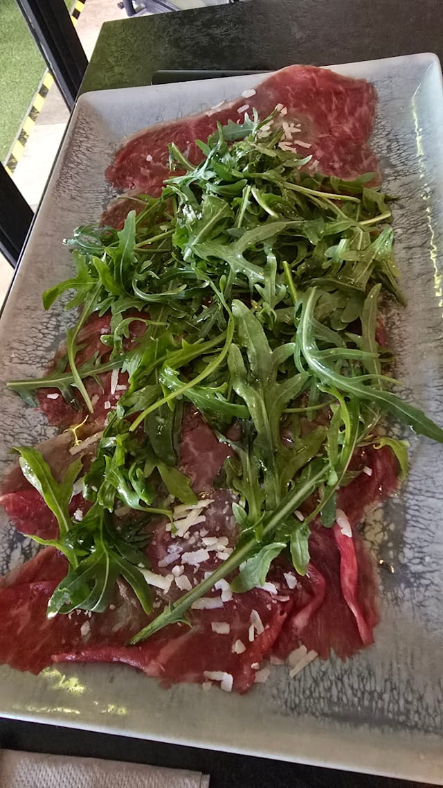 Ensalada de burrata de puglia, rúcula, tomate seco, aceituna negra y pesto