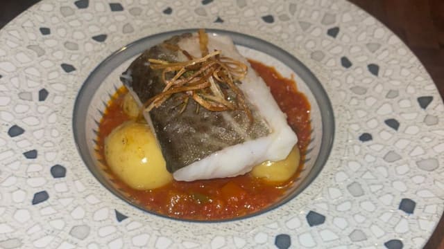 Lomo de bacalao al pil pil y aceite de oliva sobre mini pisto manchego