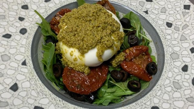 Ensalada de Burrata de Puglia, Rúcula, Tomate Seco, Aceituna Negra y Pesto