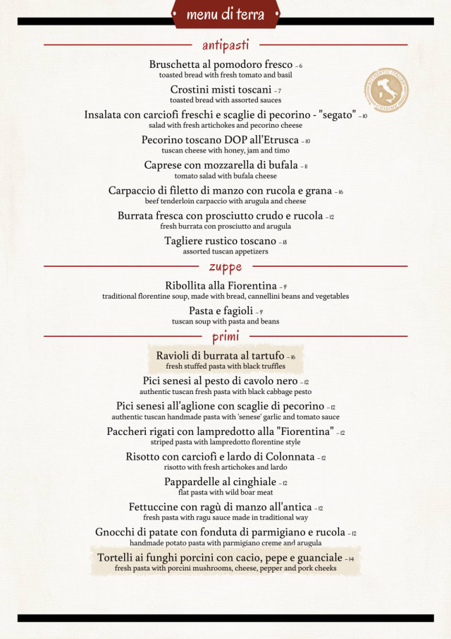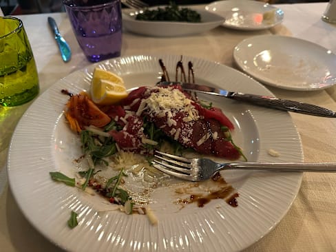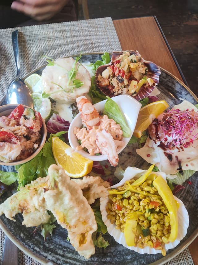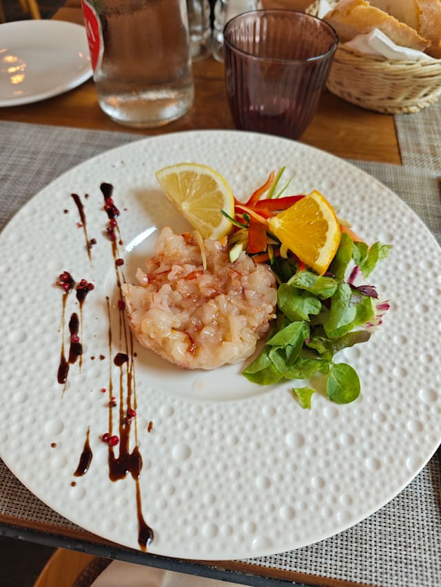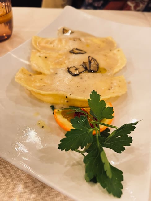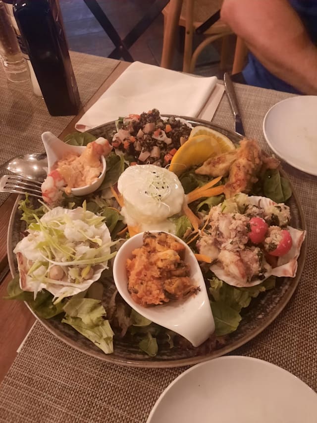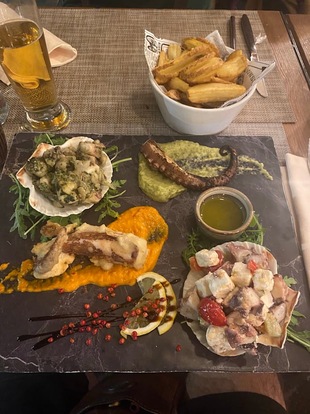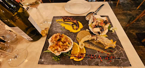 6.5/10The food was decent but not great. We chose this because we wanted seafood. My dish, the pasta with squid and truffles was the most favored of the 3 dishes we ordered. The shrimp pasta was ok. The pasta itself seemed freshly made, so that was good. The pecorino cheese with honey appetizer was quite good. Our waiter spoke excellent English among 4 other languages. Beer list was very limited and they didn't have a list of cocktails. The waiter used his phone to show the new list and said it was coming soon. The mojitos were what I suppose we should expect in Italy for a Cuban drink, so-so...