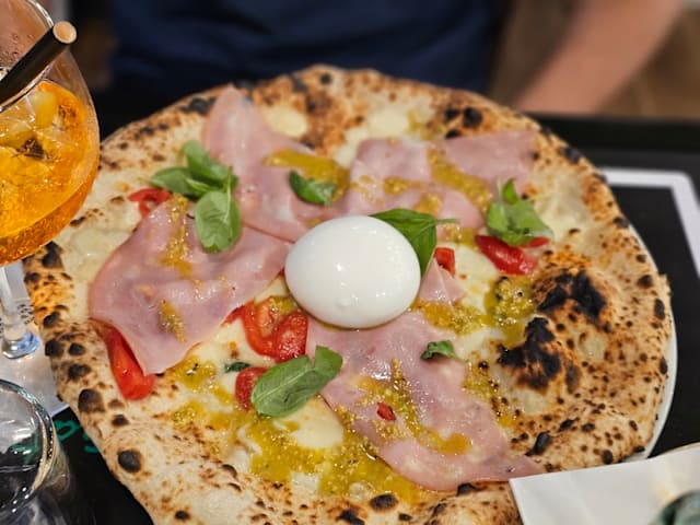 Mozzarella, crema de trufa, speck ahumado y champiñones