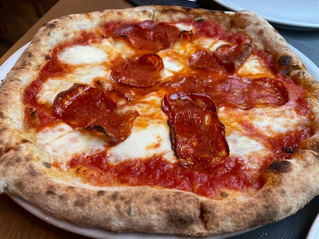 Tomate, mozzarella, 1/4 de jamón, 1/4 de alcachofas, 1/4 de champiñones y de salami picante