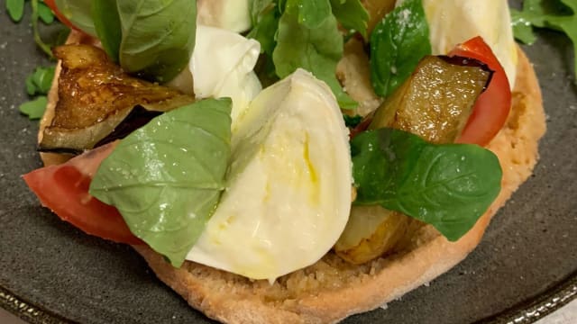 Pomodoro, melanzane, mozzarella, basilico e parmigiano