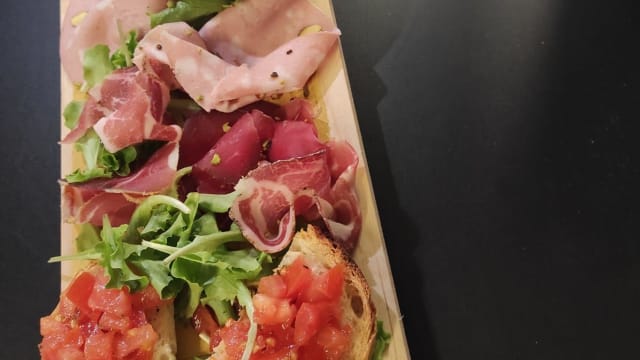 Pomodoro, bufala cotta, olive, crudo e basilico