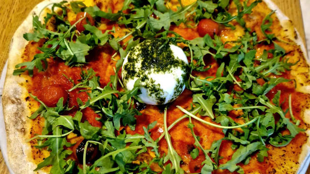 Base de stracciatella y albahaca, mozzarella, mortadela y tomate cherry