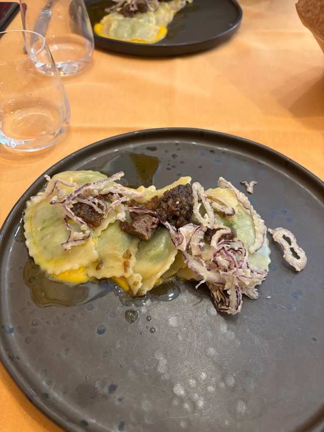 - I Ravioli FATTI IN CASA ripieni di Melanzane affumicate, guazzetto freddo di pomodoro e basilico, con scaglie di grana e menta
