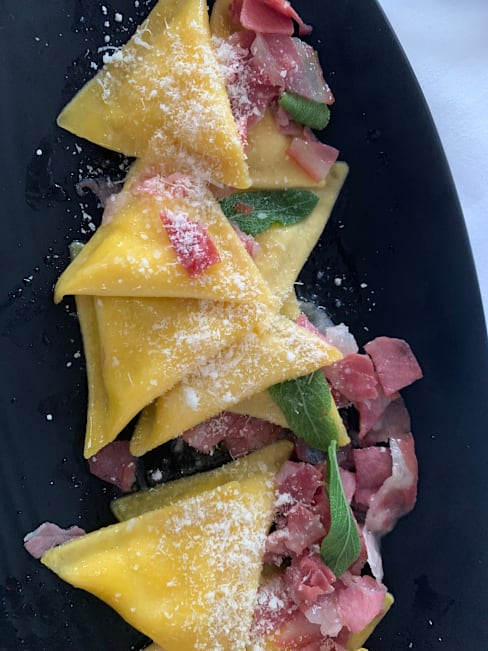 8/10Lovely setting for a restaurant with a beautiful view of the sea. The menu was varied with a good choice and lots of fresh fish. The tuna steak was amazing and the triangle ravioli was very nice! It was a very warm evening but the food and ambience were wonderful!