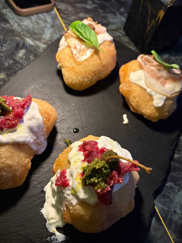 Gnocco fritto con crema di pistacchio di bronte, granella di pistacchio e zucchero a velo