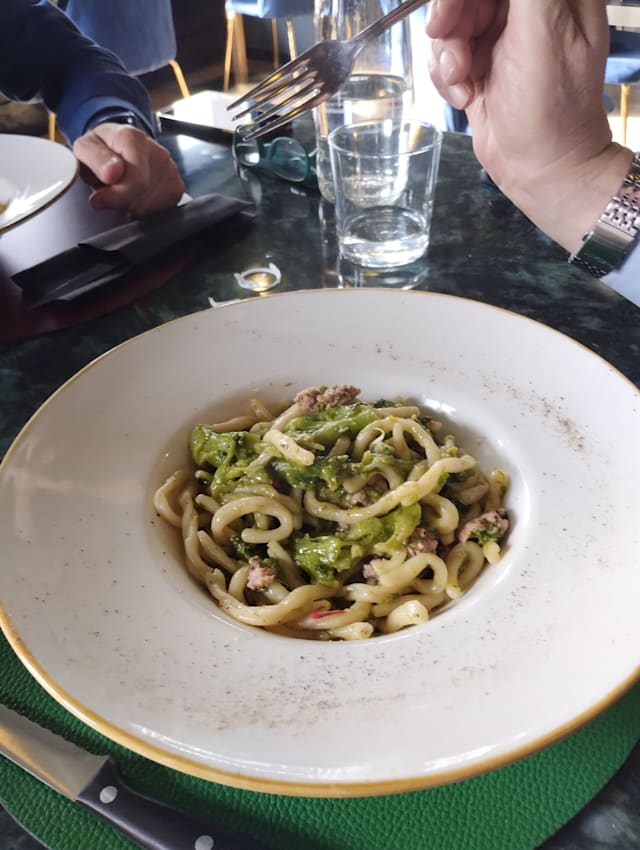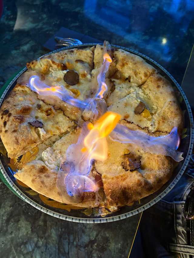 Crema di cacio e pepe, fiordilatte di napoli, guanciale al flambè, tartufo , olio evo, basilico