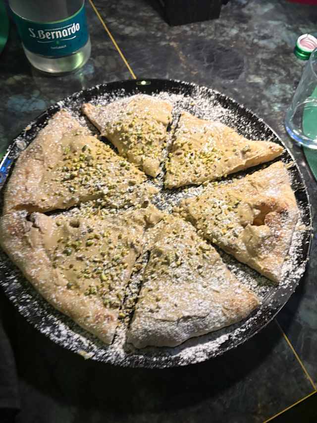 Pizza dolce con crema al pistacchio di bronte, panna montata, guarnita con granella di pistacchio e scaglie di cioccolato