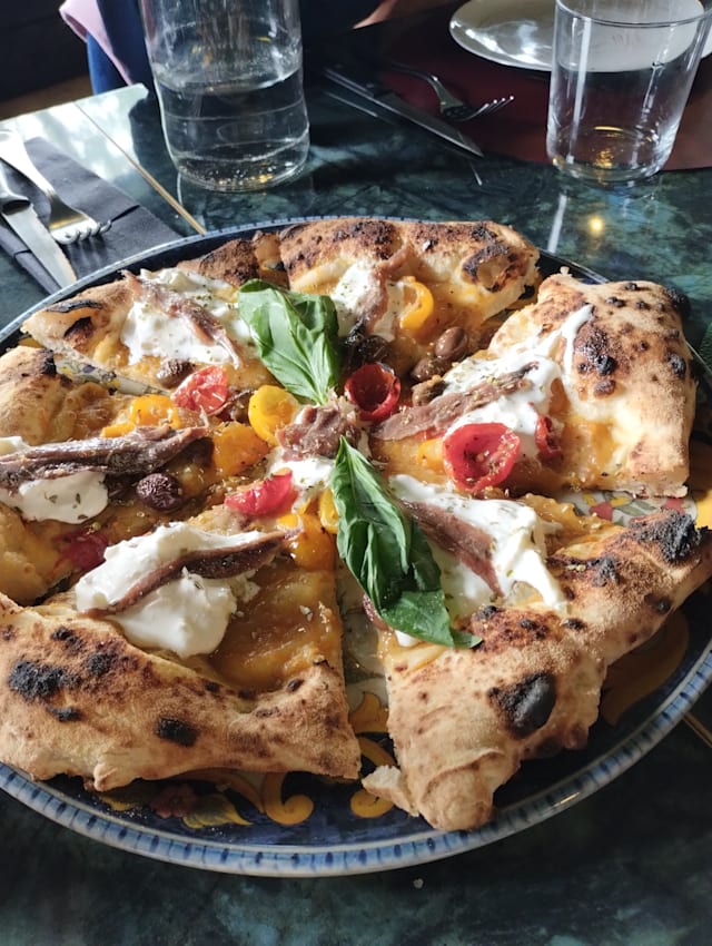 Passata di pomodoro giallo, stracciata di bufala (in uscita), pomodorini del piennolo semi- dry, alici del mar cantabrico, olive taggiasche, origano di pantelleria, olio evo, basilico