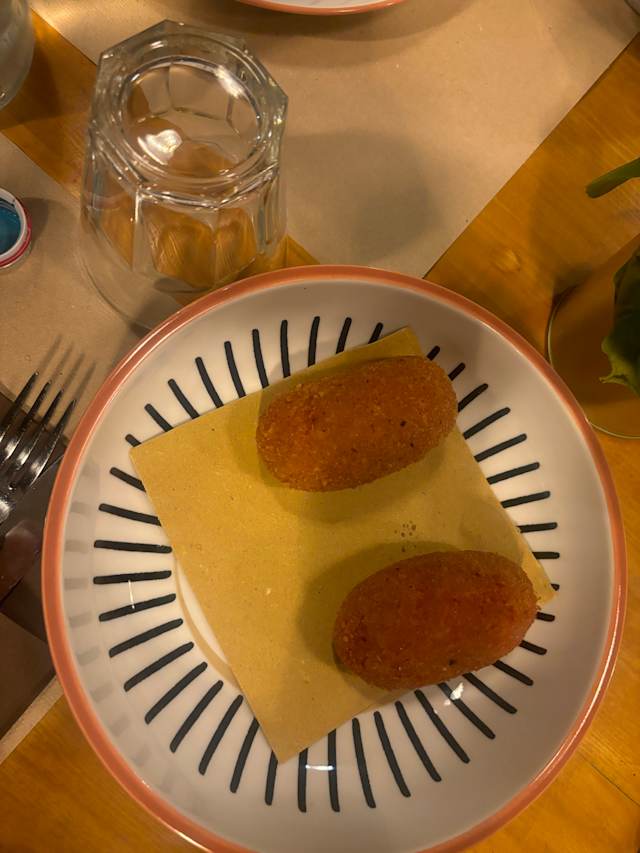 - Pasta condita con crema all’uovo, guanciale croccante e pecorino romano, racchiusa in una panatura croccante e fritta. Un boccone goloso, pieno di roma