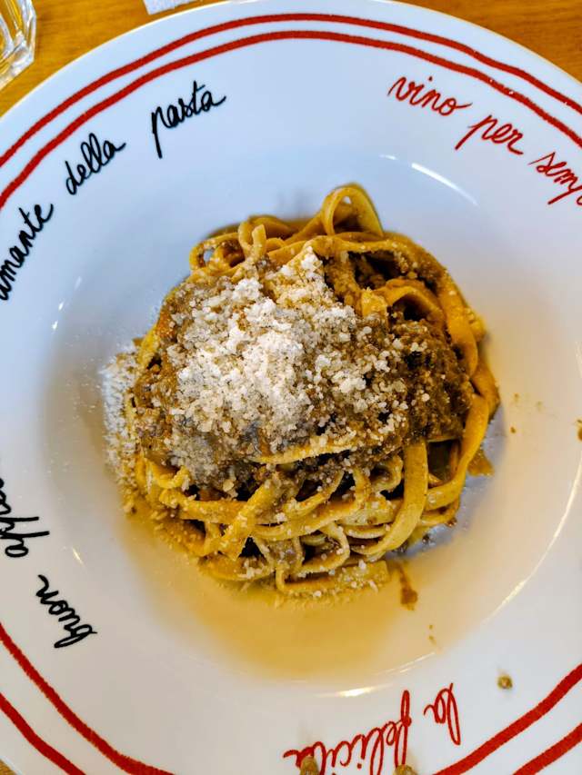 - Fettuccine fatte in casa, preparate con uova di galline allevate a terra. Condite con ragù di cinghiale e completate con parmigiano reggiano. Un piatto ricco, profumato e dal carattere deciso.