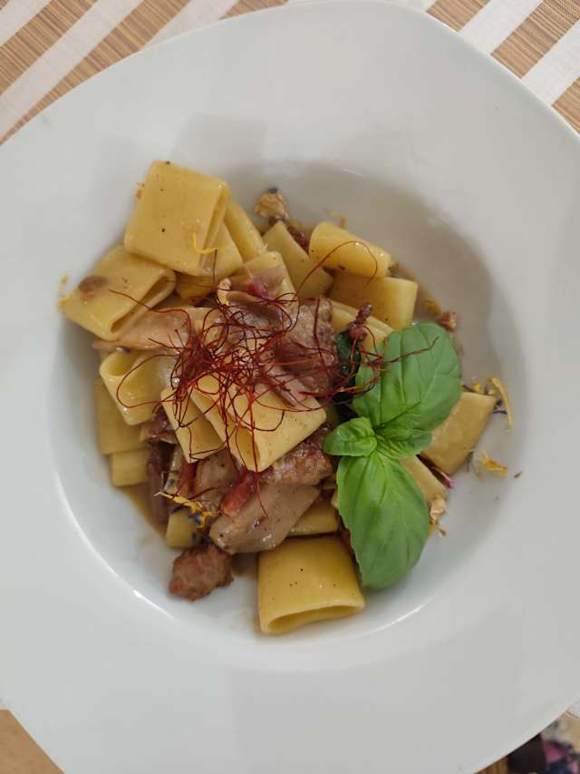 - Tagliatelle con porcini e speck pomodorini e grana in scaglie