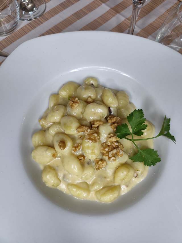 - Gnocchi di patate con crema di latte, gorgonzola, noci e guanciale croccante