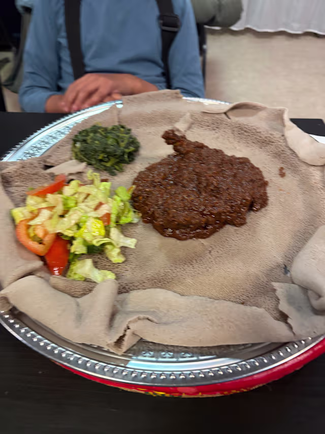 - Torkad högrev, awaze vitök, rött vin, blanda rödlök, paprika, blandat med injera serveras med sallad.