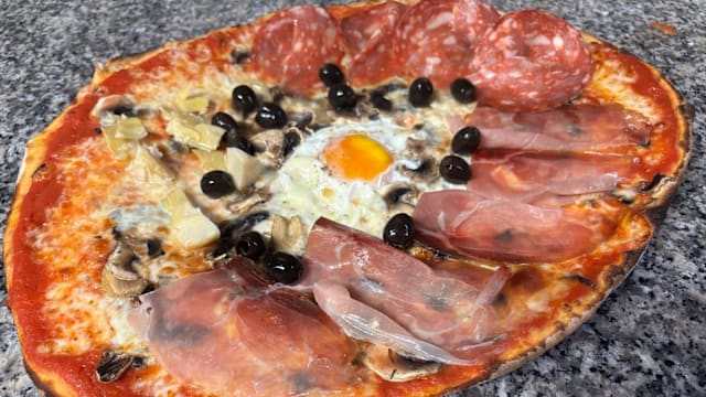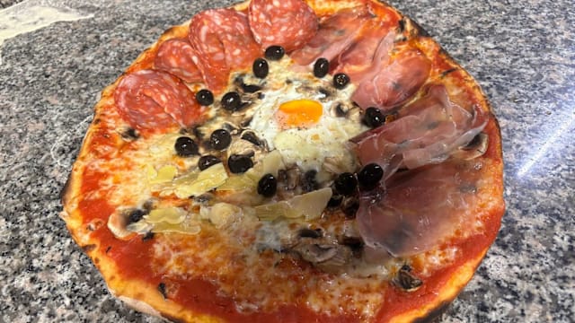Mozzarella, guanciale di norcia, salsa carbonara, scaglie di pecorino, pepe nero