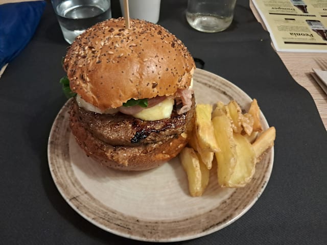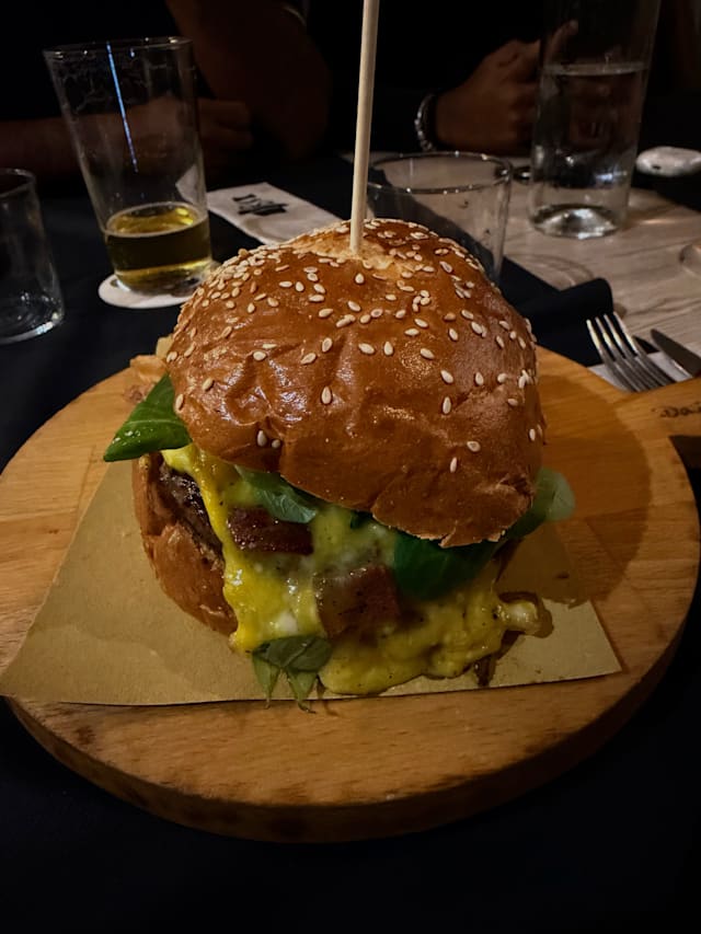 Burger di manzo Charolaise da 180g dell’Az. Agr. “La Giassara” di Sovizzo (VI) 50% frollato a secco - “salsa rubra” ricetta piemontese - insalata riccia - composta di cheddar inglese DOP - cipolla stufata - bacon croccante
