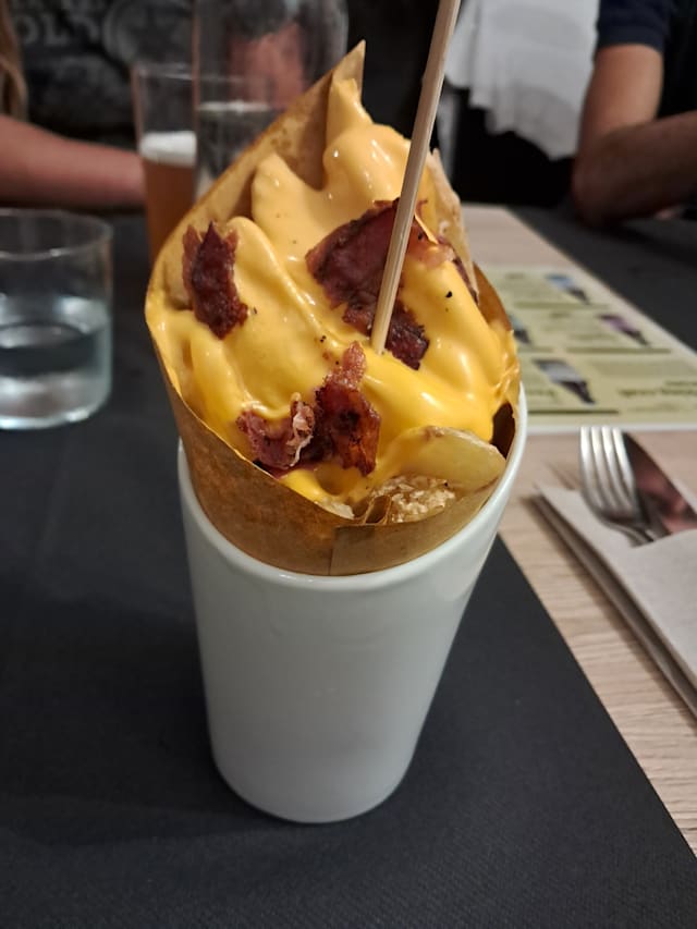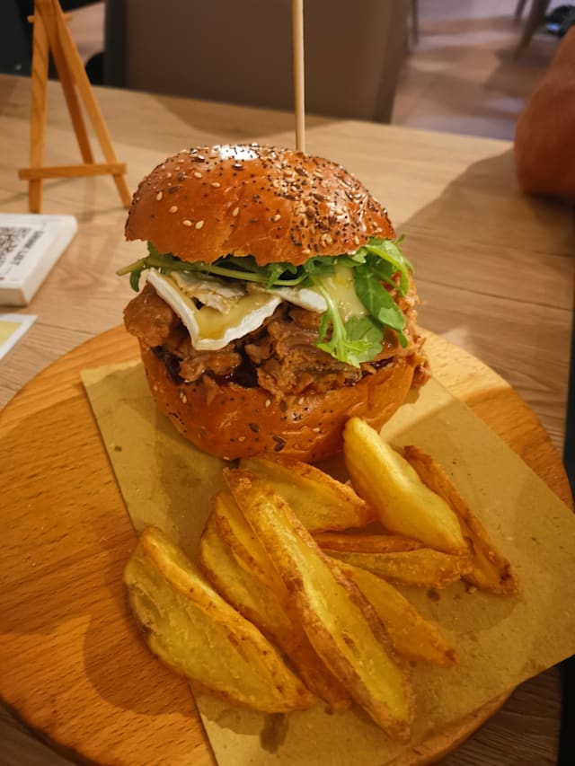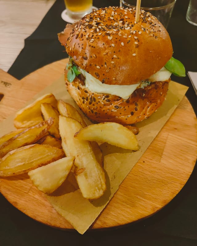 Burger di manzo Charolaise da 180g dell’Az.Agr. “La Giassara” di Sovizzo (VI) 100% frollato a secco-Fonduta di formaggio Asiago fresco DOP-porro alla brace con burro e salvia-cialda di formaggio Asiago Vecchio 12mesi DOP-guanciale al prosecco croccante-pane a lievitazione naturale