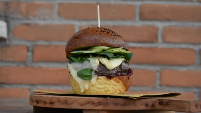 - Bun artigianale al carbone vegetale, burger di manzo 200gr, bufala DOP, pomodorini rossi confit, pesto di basilico.